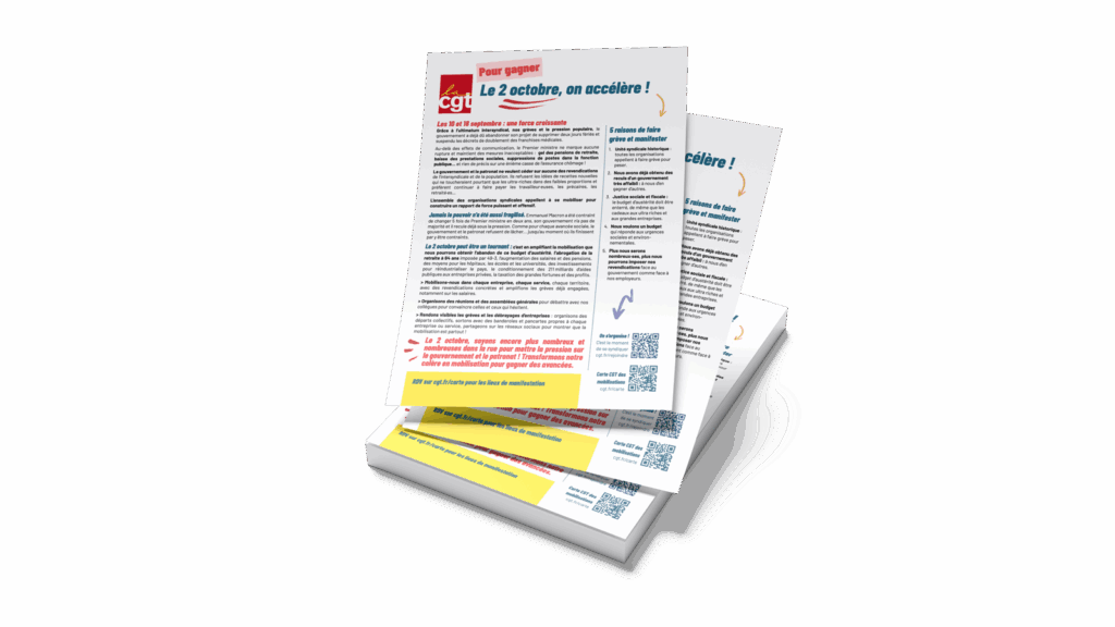 3 journées de mobilisation, 2 millions de personnes dans la rue et toujours pas de changement de braquet côté exécutif Le 2 octobre se sont près de 600.000 manifestant·es dans 250 manifestations qui ont battu le pavé à travers le pays à l’appel de l’intersyndicale. La CGT recense des mouvements de grèves importants dans plusieurs secteurs, dont la chimie, les organismes sociaux, la fonction publique territoriale, l’éducation. Des arrêts de travail ont eu lieu dans des entreprises de l’automobile et de l’agroalimentaire. L’usine de Bar-sur-Aube (métallurgie) était aujourd’hui à l’arrêt. Les verriers de Vergèze ont amplifié leur grève. Dans l’Energie les salarié·es mobilisé·es depuis un mois pour des hausses de salaires et la baisse de la TVA pour les usagers, ont multiplié les arrêts de travail…. Voir cette publication sur Instagram Une publication partagée par La CGT (@cgt_confederation) La colère est partout ici à Nîmes 😡 Cette effervescence sociale traduit aussi l’expression d’une colère vis-à-vis de la « politique de l’offre » d’Emmanuel Macron, qui se résume par l’enrichissement des plus riches et la stagnation voire l’appauvrissement des revenus du plus grand nombre. Une politique de l’offre qui paupérise nos services publics, rabote les moyens de nos collectivités territoriales, pressure le secteur du logement social, casse nos droits sociaux… pour servir le capital. Sous Macron les 500 personnes les plus riches ont doublé leurs fortunes ! #2octobre2025 #CGT Nîmes ça chauffe 🔥 pic.twitter.com/9wton4MasB — CGT AGRI (@AgriCgt) October 2, 2025 La CGT solidaire de tous·tes les travailleurs·euses 🤝 Personne n’est dupe… La CGT continue d’exiger un autre budget pour le pays et revendique l’abandon de l’ensemble du projet de budget. #2octobre « Ce ne sont pas les miettes annoncées par Lecornu sur la retraite des femmes qui nous feront renoncer ». Tatiana Gorand, secrétaire de la CGT de l’Ehpad public « les Escales » 🔴 Suivez en direct la mobilisation à l’appel de l’intersyndicale➡️ https://t.co/DkyT78gYQS pic.twitter.com/AkEeSFv3Zk — L’Humanité (@humanite_fr) October 2, 2025 « Quand on se mobilise on gagne » ✊ La CGT est déterminée à maintenir et amplifier la mobilisation, face à un pouvoir affaibli qui a décidé de continuer à écouter les marchés financiers et de demeurer sourd aux attentes des travailleuses et travailleurs du pays. « Quand on se mobilise, on gagne » rappelle Serge Ragazzacci, Secrétaire Général de la CGT 34. Retraites, salaires, égalité femmes-hommes, répartition des richesses : « le CAC40 se gave, les salariés trinquent ». 👉 Interview à Montpellier (2 oct. 2025) #CGT #Grève #Social… pic.twitter.com/NpRhjh5mHT — PLURIELLE INFO (@Plurielleinfo) October 2, 2025 « 8 ans de sacrifice ça suffit » La politique du Président Macron c’est aussi la désindustrialisation du pays, l’inflation des aides aux entreprises sans contrôle ni contrepartie (+ de 211 milliards d’après un rapport sénatorial), l’abandon des politiques publiques pour engager la transition écologique. Grève du 2 octobre: « Huit ans de sacrifices, ça suffit », assure Sophie Binet (CGT) pic.twitter.com/MwyefnRv2R — BFMTV (@BFMTV) October 2, 2025 La CGT sera dans la rue le 9 octobre prochain pour une journée d’action sur la santé et la protection sociale, notamment à la manifestation à Paris à l’appel des professionnel·les de santé et de l’action sociale, avec la participation de salarié·es de la sécurité sociale et du secteur du médicament. L’intersyndicale se réunira au lendemain du discours de politique générale pour analyser les annonces du Premier ministre, et prendre les décisions nécessaires pour la suite. , ✊ Caisse de grève L’engagement dans la lutte de nombreux secteurs professionnels donne confiance et espoir. Jamais le gouvernement n’a été aussi faible. Nous pouvons gagner des mesures de justice fiscale et sociale. Nombreux sont celles et ceux qui souhaitent apporter leurs encouragements aux salarié·es en lutte en contribuant financièrement à les soutenir. Si vous souhaitez apporter votre soutien financier aux salariés engagés dans la grève reconductible, la Confédération Générale du Travail organise la solidarité financière qui leur sera entièrement dédiée avec une redistribution transparente entre les divers secteurs professionnels concernés. Pour contribuer à la solidarité financière : En ligne en cliquant sur Solidarité Grévistes Par chèque : à l’ordre de « Solidarité CGT Mobilisation » adressé à : « Confédération Générale du Travail Service Comptabilité« , 263 rue de Paris, 93100 Montreuil. Je soutiens les grévistes ,