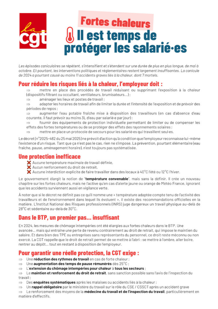 🌡️ Vagues de chaleur : une réalité désormais structurelle Alors que le dérèglement climatique s’amplifie, les épisodes caniculaires se répètent, s’intensifient et s’étendent sur une durée de plus en plus longue, de mai à octobre. Et pourtant, les interventions politiques et réglementaires restent largement insuffisantes. Début 2025, la DGT (Direction générale du travail) publiait son bilan de la canicule 2024, basé sur 1 717 interventions de l’inspection du travail. Le constat est sans appel : Conditions de travail très dégradées, même sans alerte météo, 11 accidents graves liés à la chaleur, dont 7 mortels. Ne serait-ce qu’hier, lundi 30 juin, un jeune homme de 35 ans est décédé sur un chantier après un malaise. 🌡️ Quelles sont les règles au travail en cas de fortes chaleurs ? Pour réduire les risques liés à la chaleur, l’employeur doit notamment : mettre en place des procédés de travail réduisant ou supprimant l’exposition à la chaleur (dispositifs filtrant ou occultant, ventilateurs, brumisateurs…) ; aménager les lieux et postes de travail ; adapter les horaires de travail afin de limiter la durée et l’intensité de l’exposition et de prévoir des périodes de repos ; augmenter l’eau potable fraîche mise à disposition des travailleurs (en cas d’absence d’eau courante, il faut prévoir au moins 3L d’eau par salarié·e par jour) ; fournir des équipements de protection individuelle permettant de limiter ou de compenser les effets des fortes températures ou de se protéger des effets des rayonnements solaires ; mettre en place un protocole de secours pour les salarié·es qui travaillent seul·es. Canicule : « Les fortes chaleurs et l’absence d’adaptation sont responsables chaque année de dizaines de morts » au travail, dénonce la CGThttps://t.co/eD122VKNrC — franceinfo (@franceinfo) June 17, 2025 ⚠️ Un décret gouvernemental inefficace et sans portée réelle Derrière les opérations de communication du gouvernement, le décret n°2025-482 du 25 mai 2025 impose ces quelques mesures aux employeurs, mais sans répondre aux urgences : ❌ Aucune température maximale de travail définie, ❌ Aucun renforcement du droit de retrait, ❌ Aucune interdiction explicite de faire travailler dans des locaux à 40°C l’été ou 12°C l’hiver. Le gouvernement élargit la notion de “température convenable”, mais sans la définir. Il crée un nouveau chapitre sur les fortes chaleurs, mais ne l’active qu’en cas d’alerte jaune ou orange de Météo France, ignorant que les accidents surviennent aussi en vigilance verte, notamment en fonction de la chaleur dans les bâtiments où l’on travaille (bureaux, ateliers, usines, etc) L’INRS juge dangereux un travail physique au-delà de 28°C et sédentaire au-delà de 30°C Ces mesures doivent être renforcées pour les salariés vulnérables du fait de leur âge ou de leur état de santé. À noter que si le décret ne définit pas ce qu’il nomme une « température adaptée compte tenu de l’activité des travailleurs et de l’environnement dans lequel ils évoluent », il existe des recommandations officielles en la matière. L’Organisation Mondiale de la Santé vient en effet la fixer entre 16 et 24°C et l’Institut National des Risques professionnels (INRS) juge dangereux un travail physique au-delà de 28°C et sédentaire au-delà de 30°C. 🧱 Des mesures au bon vouloir de l’employeur Le décret ne prévoit d’action qu’à condition que l’employeur reconnaisse lui-même l’existence d’un risque. Tant que ça n’est pas le cas, rien ne s’impose. La prévention, pourtant élémentaire (eau fraîche, pause, aménagement horaire), n’est toujours pas systématisée. 🏗️ Dans le BTP, un premier pas… insuffisant En 2024, les mesures de chômage intempéries ont été élargies aux fortes chaleurs dans le BTP. Une avancée… mais qui entraîne une perte de revenu contrairement au droit de retrait, qui impose le maintien du salaire. Et dans bien des TPE ou entreprises sans représentants du personnel, ce droit reste méconnu ou non exercé. La CGT rappelle que le droit de retrait (Code du travail L.4132-1) permet de se mettre à l’abri : se mettre à l’ombre, aller boire, rentrer au dépôt… tout en restant à disposition de l’employeur. 🧰 Ce que peuvent faire les salarié·es dès maintenant : 📝 Faire un écrit décrivant les effets de la chaleur et le transmettre à l’employeur et à l’inspection du travail ; 👩⚕️ Demander une visite au médecin du travail, qui peut formuler des préconisations officielles. ❌ L’inspection du travail toujours sans pouvoirs renforcés Malgré les alertes des DREETS, le gouvernement refuse de doter les inspecteurs de leviers efficaces : Aucun droit d’arrêt immédiat des travaux, Une simple mise en demeure avant verbalisation, avec 8 jours de délai pour l’employeur, En cas de recours, tout est suspendu. Et l’absence de réponse de la DREETS vaut annulation implicite. ✅ Les revendications concrètes de la CGT Pour garantir une réelle protection, la CGT exige : 📉 Une réduction des rythmes de travail en cas de forte chaleur ; ⏸️ Une augmentation des temps de pause rémunérés dès 25°C ; 🛑 L’extension du chômage intempéries pour chaleur à tous les secteurs ; 🛡️ Le maintien et renforcement du droit de retrait, sans sanction possible sans l’avis de l’inspection du travail ; 🕵️ Des enquêtes systématiques après les malaises ou accidents liés à la chaleur ; 📋 Un rappel obligatoire par le ministère du travail sur le rôle du CSE / CSSCT après un accident grave. Le renforcement des moyens de la médecine du travail et de l’inspection du travail, particulièrement en matière d’effectifs. 🧱 Une sous-déclaration chronique des accidents du travail La CGT alerte sur les pressions économiques dans le BTP, la sous-t