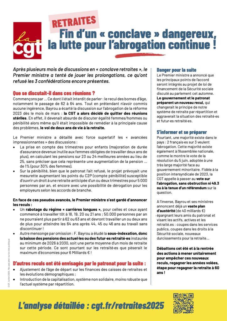 « Les organisations syndicales encore présentes ont signifié cesser de participer définitivement aux discussions » Le Premier ministre se félicite que les organisations participantes aient accepté de ne pas remettre en cause les conditions d’âge introduites dans la réforme de 2023, saluant un soi-disant « esprit de responsabilité » des partenaires sociaux, dans la perspective d’un retour à l’équilibre financier en 2030. Pour autant, les organisations syndicales encore présentes ont signifié cesser de participer définitivement aux discussions. Il identifie plusieurs « accords pour ainsi dire acquis » qui justifieraient un nouveau round de discussions de 15 jours à 3 semaines pour : Avancer l’âge d’annulation de la décote à 66 ans et demi, au lieu de 67 ans Améliorer les retraites des femmes ayant eu des enfants (en intégrant les trimestres pour enfants dans le calcul) Mieux prendre en compte la pénibilité du travail Toutes ces mesures ne s’appliqueraient qu’aux futurs départs, sans aucun effet pour les retraité·es actuels. Elles sont accompagnées de mesures de compensation financière, notamment pris sur la branche ATMP, et d’économies sur les dispositifs de cumul emploi-retraite. François Bayrou ouvre également la porte à une transformation de la gouvernance. Quant à la question de la revalorisation des pensions, elle sera abordée mi-juillet dans le cadre des débats sur les finances publiques. La majorité des dispositions nécessiterait une transposition législative, potentiellement dans le cadre du prochain Projet de Loi de Financement de la Sécurité Sociale (PLFSS). Un rapport de force déséquilibré au profit du patronat La délégation permanente a été convoquée sur la base implicite que, faute d’accord, la réforme de 2023 continuerait de s’appliquer. Le gouvernement a ainsi offert au patronat un cadre favorable pour dérouler une série de propositions régressives, sans jamais envisager un compromis remettant en cause la réforme. La CGT a quitté ces réunions lorsqu’il est apparu officiellement que l’abrogation des mesures d’âge n’était pas même au menu, écartée par François Bayrou en cours de route. ➡️ Aucune amélioration réelle n’est proposée. Le retour à l’âge légal de départ à 62 ans n’est même pas évoqué. De graves reculs sur le dispositif » carrières longues » sont même possibles. La fuite organisée d’un pré-rapport du Conseil d’orientation des retraites, quelques jours avant la séance de rédaction du projet d’accord, illustre les torpillages des macronistes. I / Annulation de la décote à 66 ans et demi Une concession légère sur le taux plein automatique. Actuellement, les personnes aux carrières hachées — souvent des femmes — doivent atteindre 67 ans pour voir la décote annulée en cas de carrière incomplète. Environ 70 000 départs annuels à cet âge (13 % des femmes, 8 % des hommes) 11 % des départs se font avec une décote Les plus pénalisé·es par cette décote seraient concerné·es Cette mesure permettrait de partir 6 mois plus tôt pour éviter une décote. Mais elle ne règle pas le problème de fond : le coefficient de proratisation continue de s’appliquer aux carrières incomplètes. II / Légère amélioration des retraites des femmes ayant eu des enfants Aujourd’hui, les trimestres de majoration pour maternité ne servent qu’à l’obtention du taux plein. Lorsqu’une femme atteint cette durée grâce à ses cotisations, ces trimestres deviennent « non-utiles ». La proposition : permettre aux femmes d’utiliser ces trimestres pour que leur pension soit calculée sur les 24 ou 23 meilleures années (au lieu de 25), selon le nombre d’enfants. ❗ Limites : Mesure applicable uniquement si 25 années pleines sont prises en compte Exclusion des femmes aux carrières hachées, courtes ou mixtes (public/privé) Pas de clarification sur les situations polypensionnées et surtout une revalorisation de seulement 1%, pour les femmes ayant eu des enfants (30% des femmes concernées) III / Carrières longues : un petit plus (intégration de 2 trimestres maternité dans le dispositif) et un énorme recul (durcissement pour les personnes ayant commencé à travailler entre 19 et 21 ans) Le dispositif « carrières longues » permet de partir avant l’âge officiel de 64 ans si on a commencé à travailler avant 21 ans. Les « carrières longues restent rallongées.Il repose sur les trimestres cotisés, avec certaines périodes assimilées (chômage, maladie, service national…). Mais les trimestres de majoration maternité en sont exclus, pénalisant les femmes. La proposition : retenir jusqu’à 2 trimestres maternité dans le calcul des carrières longues, favorisant un départ anticipé pour les mères.Cette mesure pourrait être transposée par décret, via une modification de l’article D.351-1-2 du Code de la Sécurité sociale. A l’inverse, les conditions pour accéder au dispositif « carrières longues » seraient durcies. Par exemple il faudrait 7 trimestres l’année des 19 ans au lieu de 5, pour partir à 62 ans.Chaque année, environ 50.000 femmes et hommes ayant commencé à travailler avant 21 ans sortiraient du dispositif… et seraient tenus d’attendre 64 ans pour partir en retraite, soit 4 ans de recul pour certains, en cumulant le report dû à la réforme 2023 et cette disposition. IV / Meilleure prise en compte de la pénibilité (coût estimé : 400 M€) François Bayrou évoque « deux points et demi d’accord » : Réintégration de 3 critères ergonomiques dans le Compte Professionnel de Prévention (port de charges lourdes, vibrations mécaniques, postures pénibles), ne figure pas le 4ème critère supprimé en 2017, l’exposition aux substances chimique Cartographie des métiers exposés, assortie d’une politique de prévention Mais un désaccord profond persiste sur la réparation : syndicat