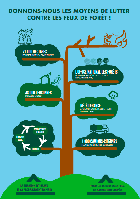 700 hectares à Marseille, 2 000 près de Narbonne, 500 dans les Cévennes, plus de 400 dans l’Hérault… Le sud de la France est en proie aux flammes – et la saison ne fait que commencer. La question des feux de forêts se fait de plus en plus brûlante. Déjà en 2022, plus de 71 000 hectares étaient partis en fumée, provoquant l’évacuation de plus de 48 000 personnes – du jamais-vu en France depuis la Seconde Guerre mondiale. Comme l’a expliqué le Giec, l’un des impacts majeurs du réchauffement climatique est la multiplication et l’amplification des feux de forêt. Par le CO2 qu’ils rejettent, ces derniers aggravent à leur tour le réchauffement climatique, et se met donc en place un cercle vicieux aux conséquences économiques et écologiques désastreuses. Pour les acteurs impliqués dans cette lutte, les vannes sont coupées ! Face à cette menace, les moyens des différents acteurs agissant contre les feux de forêts ont été considérablement réduits : l’Office national des forêts (ONF) a vu ses effectifs passer de 15 000 agent·es à 8 000 en moins de quarante ans ; Météo France, service public officiel de la météorologie et de la climatologie, dont la compétence est essentielle en matière de risque incendie et de réchauffement climatique, a perdu un tiers de ses effectifs (environ 1 200 postes) en quinze ans ; les services départementaux d’incendie et de secours (SDIS), en charge de la gestion des sapeurs-pompiers à l’échelle départementale, déplorent un manque significatif d’agent·es formé·es pour la spécialité « feux de forêts », le retrait depuis 2006 d’environ mille camions-citernes feux de forêts (CFF) et la tendance visible à une augmentation des délais d’intervention. Tract feux de forêts disponible en téléchargement ci-dessous Les propositions de la CGT : La CGT est porteuse de réponses concrètes, à la hauteur des problématiques qui ne manqueront pas de se développer dans les années à venir : Une meilleure prévention contre les feux de forêts : renforcer les effectifs des acteurs jouant un rôle dans la prévention et la prévision des feux de forêts (services de l’État, collectivités, ONF, Météo France…) ; redéfinir les politiques d’aménagement et d’urbanisation (distance entre habitations et forêts, plantation de feuillus en bordure de forêt, réévaluation des stratégies de coupe-feux) et mieux les faire respecter. Plus de moyens de lutte contre les incendies : renforcer les effectifs des SDIS dans toute la France ; faciliter la libération des sapeurs-pompiers volontaires par leurs employeurs, sans qu’elles et ils n’aient à poser de congé ; considérer les campagnes des pompiers professionnel·les comme du temps de travail, et non comme du temps pris pendant leurs congés ; renouveler, renforcer et moderniser les équipements et véhicules (CFF, Canadair…) des sapeurs-pompiers ; lancer la réflexion sur la conception et la production d’un avion bombardier d’eau en France. Une filière bois-forêt à la hauteur des enjeux environnementaux : doter la filière bois-forêt des moyens nécessaires au bon fonctionnement de ses quatre missions : préservation de l’espace naturel contre les incendie, exploitation des forêts et leur entretien, valorisation de la transformation et de l’utilisation du bois, préservation des paysages naturels et développement d’une haute qualité d’accueil du public, en sécurité. Une maîtrise publique des forêts et autres espaces naturels : Pour mettre en place une stratégie efficace contre les feux de forêt, mise à mal par l’éclatement des responsabilités et la privatisation de nombreuses missions, la CGT propose la création d’un pôle public de la forêt et des espaces naturels regroupant toutes les composantes étatiques concernées par cette thématique ainsi que l’ONF. Accéder au matériel de la campagne « feux de forêts » SYNTHÈSE Télécharger la synthèse – Format pdf – version web ici Télécharger la synthèse – Format pdf – version imprimable ici NOTE COMPLETE Télécharger la note complète – Format pdf – version web ici Télécharger la note complète – Format pdf – version imprimable ici TRACT Télécharger le tract couleur – Formats pdf – idml – indd ici Télécharger le tract fond blanc – Formats pdf – idml – indd ici S’abonner à la newsletter