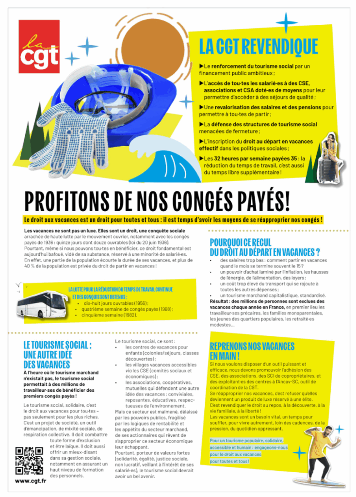 Les vacances ne sont pas un luxe, elles sont un droit Une conquête sociale arrachée de haute lutte par le mouvement ouvrier, notamment avec les congés payés de 1936 : quinze jours dont douze ouvrables (loi du 20 juin 1936). Pourtant, même si nous pouvons tou·tes en bénéficier, ce droit fondamental est aujourd’hui bafoué, vidé de sa substance, réservé à une minorité de salarié·es. En effet, une partie de la population écourte la durée de ses vacances, et plus de 40 % de la population est privée du droit de partir en vacances ! La lutte pour la réduction du temps de travail continue et des conquis sont obtenus : dix-huit jours ouvrables (1956) ; quatrième semaine de congés payés (1968) ; cinquième semaine (1982). , Pourquoi ce recul du droit au départ en vacances ? des salaires trop bas: comment partir en vacances quand le mois se termine souvent le 15 ? un pouvoir d’achat laminé par l’inflation, les hausses de l’énergie, de l’alimentation, des loyers ; un coût trop élevé du transport qui se rajoute à toutes les autres dépenses ; un tourisme marchand capitalistique, standardisé. Résultat : Des millions de personnes sont exclues des vacances chaque année en France, en premier lieu les travailleur·ses précaires, les familles monoparentales, les jeunes des quartiers populaires, les retraité·es modestes… , Le tourisme social : une autre idée des vacances À l’heure où le tourisme marchand n’existait pas, le tourisme social permettait à des millions de travailleur·ses de bénéficier des premiers congés payés ! Le tourisme social, solidaire, c’est le droit aux vacances pour tou·tes – pas seulement pour les plus riches. C’est un projet de société, un outil d’émancipation, de mixité sociale, de respiration collective.Il doit combattre toute forme d’exclusion et être laïque. Il doit aussi offrir un mieux-disant dans sa gestion sociale, notamment en assurant un haut niveau de formation des personnels. Le tourisme social, ce sont : les centres de vacances pour enfants (colonies/séjours, classes découvertes) ; les villages vacances accessibles via les CSE (comités sociaux et économiques) ; les associations, coopératives, mutuelles qui défendent une autre idée des vacances: conviviales, reposantes, éducatives, respectueuses de l’environnement. Mais ce secteur est malmené, délaissé par les pouvoirs publics, fragilisé par les logiques de rentabilité et les appétits du secteur marchand, de ses actionnaires qui rêvent de s’approprier ce secteur économique leur échappant. Pourtant, porteur de valeurs fortes (solidarité, égalité, justice sociale, non lucratif, veillant à l’intérêt de ses salarié·es), le tourisme social devrait avoir un bel avenir. , Reprenons nos vacances en main ! Si nous voulons disposer d’un outil puissant et efficace, nous devons promouvoir l’adhésion des CSE, des associations, des SCI de copropriétaires, et des exploitant·es des centres à l’Ancav-SC, outil de coordination de la CGT. Se réapproprier nos vacances, c’est refuser qu’elles deviennent un produit de luxe réservé à une élite. C’est revendiquer le droit au repos, à la découverte, à la vie familiale, à la liberté ! Les vacances sont un besoin vital, un temps pour souffler, pour vivre autrement, loin des cadences, de la pression, du quotidien oppressant. Pour un tourisme populaire, solidaire, accessible et humain : engageons-nous pour le droit aux vacances pour toutes et tous ! , La CGT revendique : Le renforcement du tourisme social par un financement public ambitieux ; L’accès de tou·tes les salarié·es à des CSE, associations et CSA doté·es de moyens pour leur permettre d’accéder à des séjours de qualité ; Une revalorisation des salaires et des pensions pour permettre à tou·tes de partir ; La défense des structures de tourisme social menacées de fermeture ; L’inscription du droit au départ en vacances effectif dans les politiques sociales ; Les 32 heures par semaine payées 35 : la réduction du temps de travail, c’est du temps libre supplémentaire ! , Télécharger le tract Version pour affichage numérique (RVB) – Télécharger Version pour impression (CMJN) – Télécharger Version pour impression avec traits de coupe – Télécharger ,
